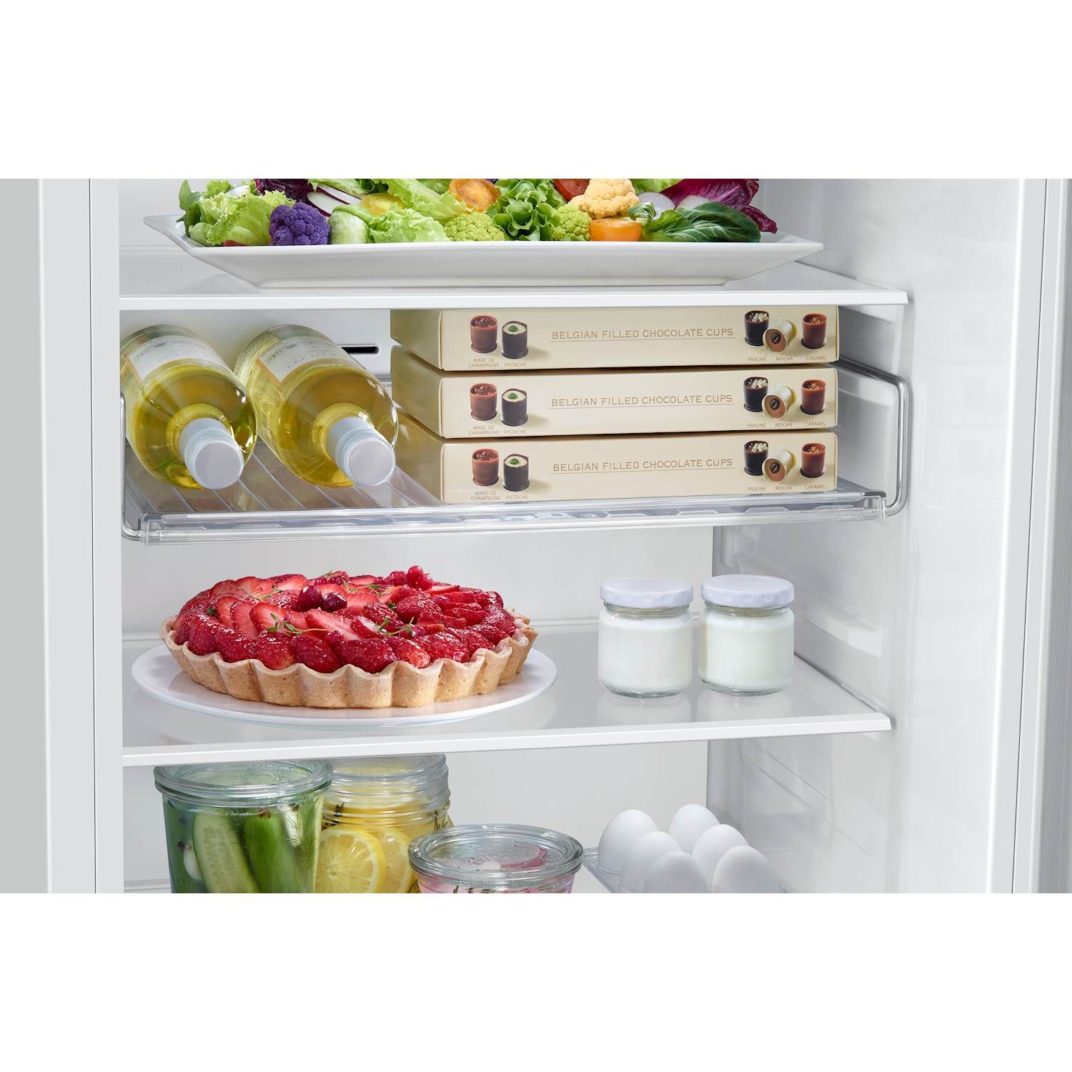 Dit køleskabsrum bruges mere effektivt med en vinhylde, der kan bruges til alt. Takket være det bredere design kan du ikke kun opbevare flasker af standardstørrelse, men også tykkere vinflasker, såsom champagneflasker. Den fladere form gør også opbevaringsfladen mere alsidig, da den kan opbevare anden mad, f.eks. pizza og æggekartoner.