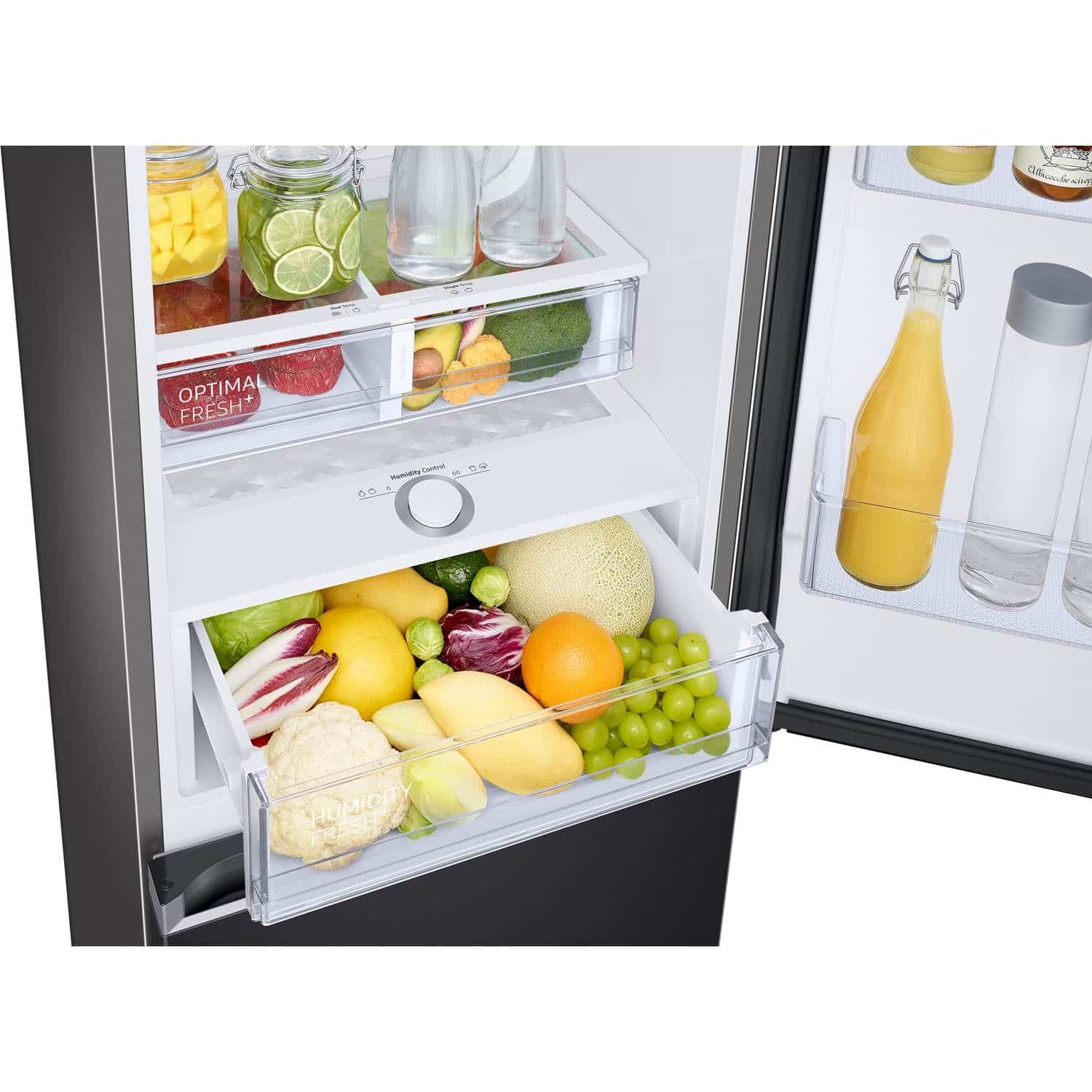 Samsung RB34C675EB1/EF er et rummeligt Black Steel køle/fryseskab med optimale forhold for dine friske råvarer takket være de to skuffer til frugt og grøntsager og hele vejen rundt om køling. Læs hele beskrivelsen