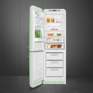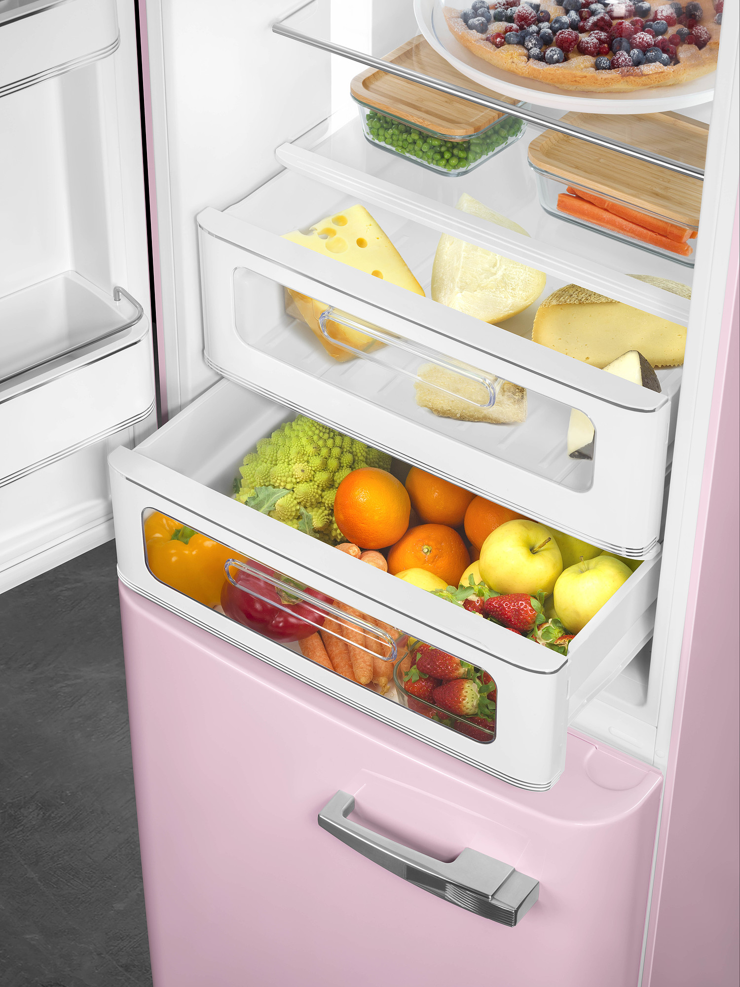 Kombineret køle-/fryseskab fra Smeg i lyserød med 3 fryseskuffer, No Frost og Multi Flow kølesystem. Læs hele beskrivelsen